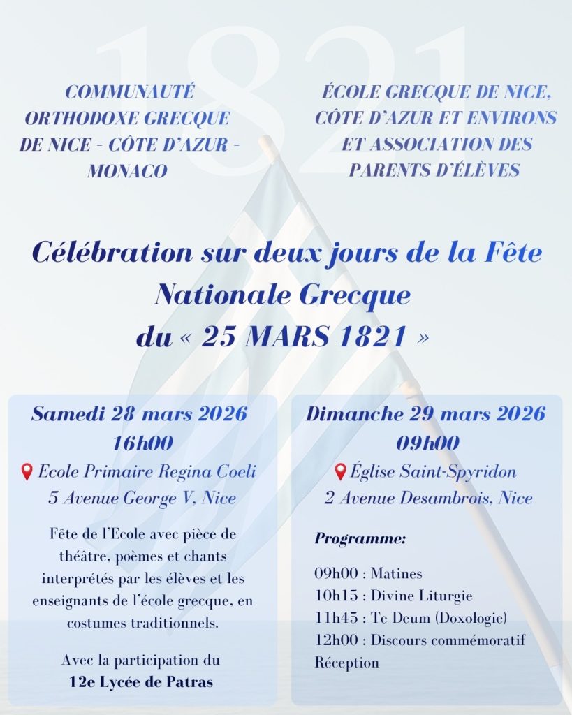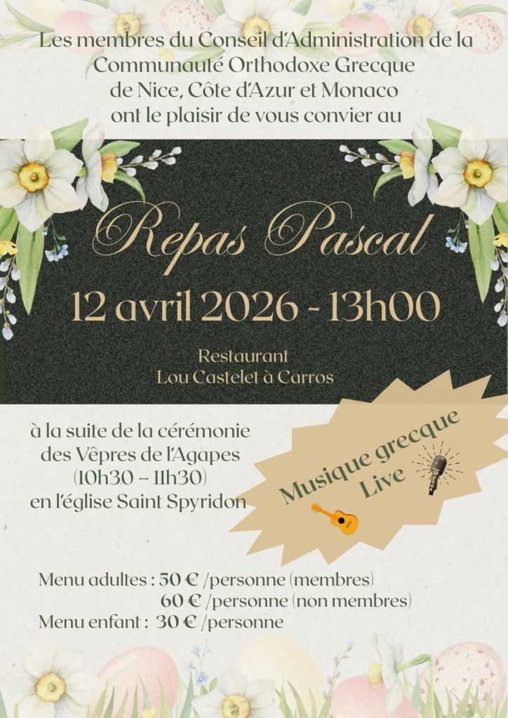 La Communauté Grecque de Nice, Côte d’Azur et Monaco a le plaisir de vous convier au repas pascal qui aura lieu le dimanche 12 avril 2026.